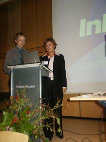 Efter Olle Sundh var turen kommen till Christine Löfvenberg, styrelseordförande och konsult för FM Konsulterna i Göteborg. "Hur frigör man resurser med Facility Management?" var frågan. Med fokus på kostnaderna och en effektiv utveckling finns goda möjligheter berättade Christine Löfvenberg och angav av de 72.000 kronor som varje elev i genomsnitt kostar skolan utgör hyran 16.000. Här finns alltså mycket pengar för att höja effektiviteten. Niclas t v assisterade under hela dagen som vår tekniker. |