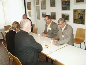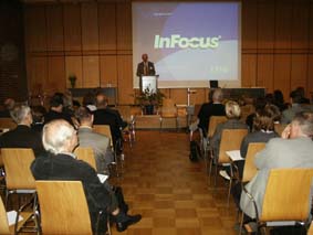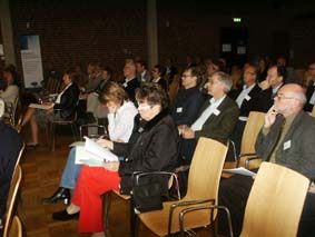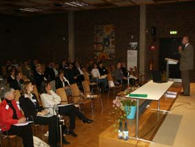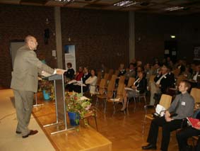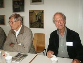 | På förmiddagen, innan fikat, talade också Jan Amcoff, t h, fil.dr. och kulturgeograf, Institututet för Framtidsstudier, Stockholm, om befolkningsutvecklingen regionalt och nationellt, vilket i hög grad påverkar behovet av lokaler för utbildningsändamål. Han nämnde bl.a. Lunds kommun och flyttningarna, som kan komma att innebära tomma skolor när 90-talsbarnen vuxit upp. | ![]() |