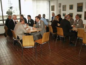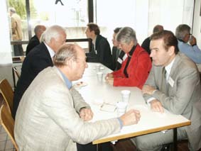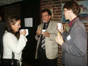 | Så var det dags för förmiddagsfika med samtal och möten, mingel och mackor. Närmast i bild Jarl Olsson, Catella. | ![]() |